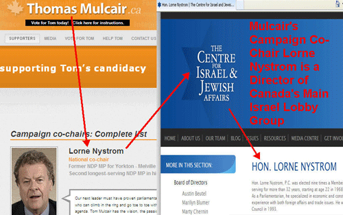 At any rate, Mulcair had given him “written assurance” that he would respect the NDP’s current policy on Palestine, and that was good enough. The idea that this assurance was inconsistent with Mulcair’s earlier profession of zionist fealty, or that he may have just been manipulating him to buy leadership support, didn’t compute.It wouldn’t have made any difference if I had told him that Mulcair’s co-campaign chairman is former MP Lorne Nystrom, now a director of the Centre for Israel and Jewish Affairs, the Israel Lobby’s main pressure group.