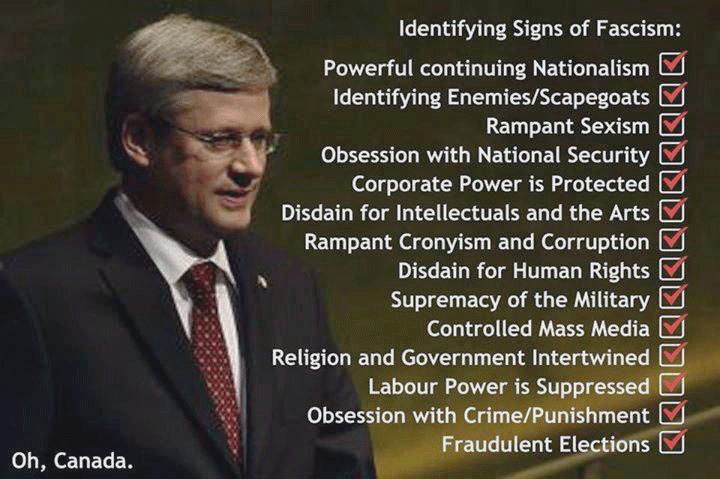 “I refer, of course, to Stephen Harper’s coup d'état of Oct. 27 which did great, perhaps irreparable, violence to Canada's Constitution and rule of law. The random shooting of a soldier on ceremonial guard duty at the war memorial in Ottawa on Oct. 22 was the excuse Harper needed to introduce Bill C-44, which would grant the RCMP and the Canadian Security Intelligence Service virtual police-state powers of surveillance and arrest thereby nullifying the Charter of Rights and Freedoms and formalizing the fascist order of Canada. “To analyze this death of a nation, I am joined in the studio by WTFN’s political correspondent Eric Blair. Welcome back, Eric. First, do you agree that Harper staged a coup on the country?”