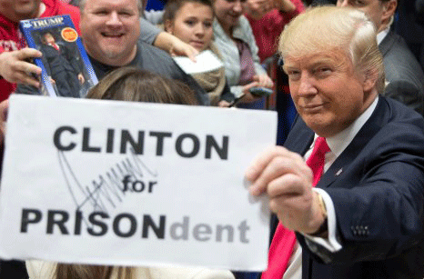 CLAY: “Are you referring to his backsliding on his promise to have Hillary Clinton charged with treason?” HOWE: “Well, that’s the most conspicuous example. For a candidate who openly called for Clinton to be sent to prison, his come-down is hard to accept at face value, to say nothing of his expression of sympathy for her after the election. The only way Trump’s about-face makes sense is that he was persuaded, coerced, bribed—pick your participle—into not following through on his promise.