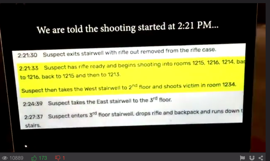 First, he gives the timestamp 3:13 p.m. and says the shooter is thought to be “Nik Cruz.” For good measure he puts up a pic of Cruz complete with his age in the lower right. He also says he believes this person has been “neutralized.” Neither Hogg nor anyone else at the time could have known Cruz was the shooter or that he had been killed or otherwise subdued. The Broward Sheriff’s Office captured and identified Cruz at 3:41 in the neighbouring city of Coral Springs. How could Hogg have seen 28 minutes into the future, much less have had a pic of Cruz on hand to put in his video?