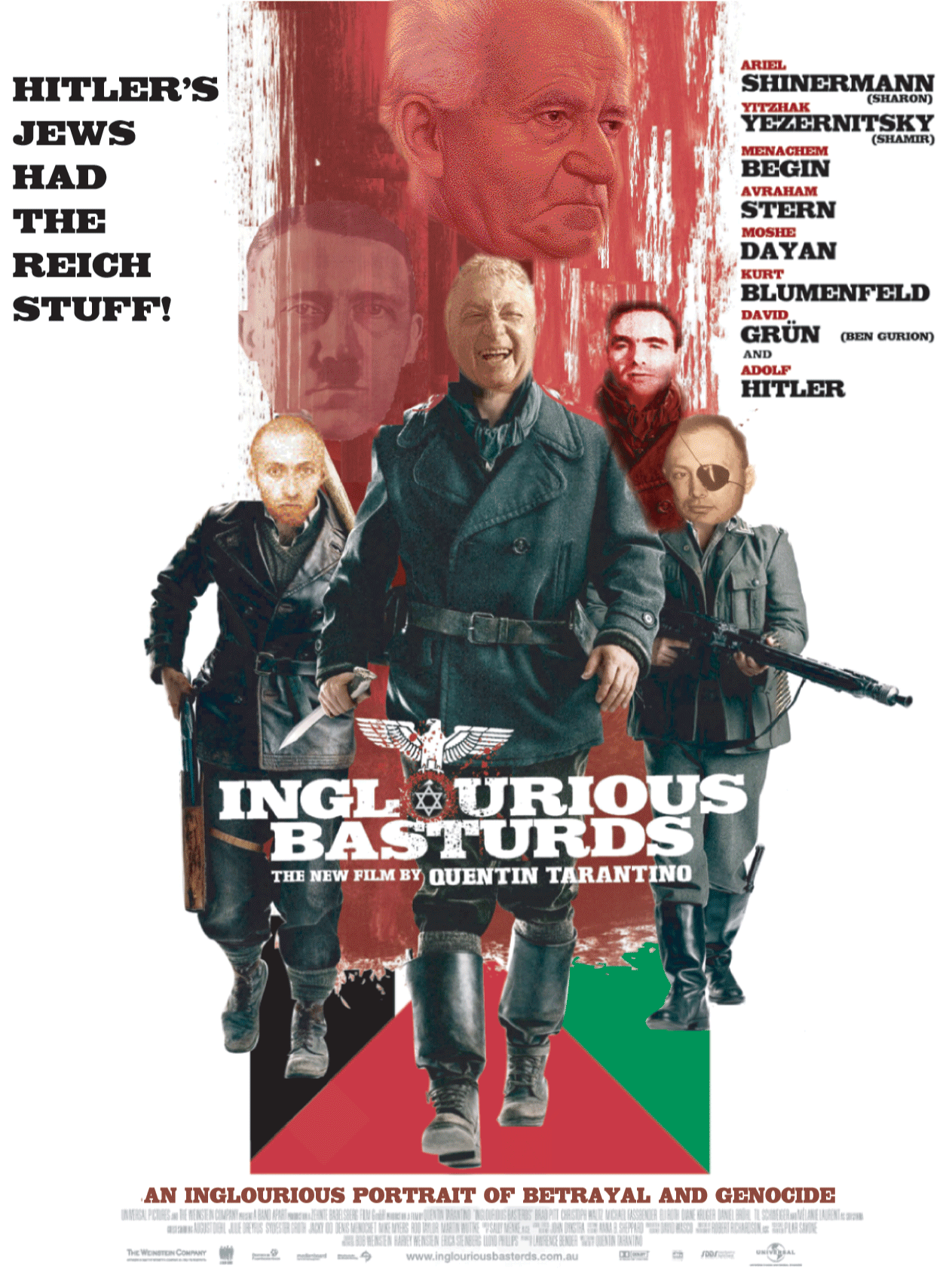 Kale: “I’m not. If the academy really wanted to reward excellence, it would give the award to Winter’s Bone, arguably the best acted movie of the year, and if there is any justice, Jennifer Lawrence should win for best actress over Natalie Portman’s overwrought ballerina.” Boyle: “On this point we agree. Portman doesn’t come close, but now we come to my favourite award, The Leni, which honours outstanding achievement in holocaust propaganda.” Kale: “Well, this was a tough pick, especially since there weren’t any contenders.” Boyle: “What?!” Kale: “You heard me—for the first time in more than 50 years not a single nominated movie dealt with the Holocaust®.” Boyle: “So which film gets the award? Is there an award?” Kale: “Oh yes, but before I get to it, I want to focus on the significance of this absence. There is actually serious talk about the Holocaust® being played out. More than 180 films have been made about the Jews under Hitler, more than any other topic. What, if anything, is left to say? I’ll tell you, nothing! Holocaust® fatigue has finally set in.” Boyle: “Why now? Hollywood has never had a shortage of Holocaust® stories, real or fabricated. In short succession we’d had The Reader, Defiance, Valkyrie…” Kale: “Right, but Inglourious Basterds was the last straw. This farcical Jewish torture spectacle was so gratuitously tasteless and dishonest that it did more to discredit the Holocaust® than prop it up. What it did was inadvertently show the true Nazi-like nature of zionist Jews, and that has made Jewish suffering seem more contrived than real. Against the real Holocaust® that Jews are inflicting today in Palestine, flogging the Holocaust® now seems preposterous, even indecent.” Boyle: “Is there any indication that Holocaust® movies are running into trouble?” Kale: “Yes; in fact, Branko Lustig, one of the award-winning producers of Schindler’s List, has been trying without success to find backers for a movie about Jews in the Shanghai ghetto.” Boyle: “Shanghai?! Are we supposed to make a movie about every city that had a Jewish ghetto?”