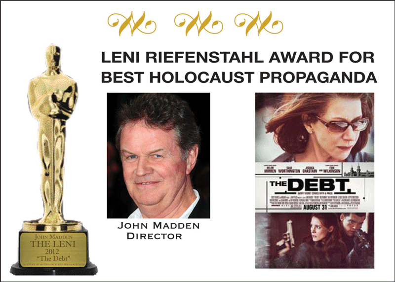 KALE: “This has to do with the film’s title and the transparent lack of justice driving the latter-day agents. Killing Vogel is all about selfishness and ego. In 1997, Rachel’s daughter penned a book extolling her mother’s honour killing of Vogel, but when an old man in a Ukrainian nursing home surfaces claiming to be Vogel and the press gets wind of it, the book is put in jeopardy. If this old man turns out to be Vogel, Rachel must kill him to settle “the debt” she owes for taking credit for a 30-year-old killing that she apparently didn’t do. Essentially, the The Debt is concerned with public relations as a justification for premeditated murder. So much for justice and the great reputation of Mossad!” BOYLE: “Anything else?” KALE: “One last point. The film garners inflated credibility from its excellent cast, especially Helen Mirren in the lead role. When an A-list actress like Mirren, and A-list actors like Wilkinson and Worthington lend their collective talent and reputation to such a movie, the propaganda can easily pass for truth.” BOYLE: “You make a convincing argument, as always. Before we move on to the other categories, there is one prediction you made last year that didn't come true.” KALE: “Yes. I thought that Bruno Lustig‘s inability to find funding for his film about Jews in Shanghai—of all places—was one sign that Hollywood was finally getting the message that the Holocaust® genre was creatively, morally and politically exhausted. Even the Jewish Telegraph Agency speculated that the Holocaust® movie had been done to death. Alas, there is more pro-Israel propaganda on the way, including a new Steven Spielberg version of Moses, the same Moses that Shlomo Sand said never existed. Where are the scripts about Cast Lead, Mavi Marmara, Qana or some other aspect of our modern Holocaust® featuring an updated fascist villain?” BOYLE: “Have you forgotten who runs Hollywood?” KALE: (sighs) “No, I haven’t. As the saying goes: ‘There’s no business like Shoah business,’ so I guess we’ll be talking about The Leni for some time. BOYLE: “We’ll have to wait to see if the Academy agrees with your choice, but I can’t see how it could disagree.”