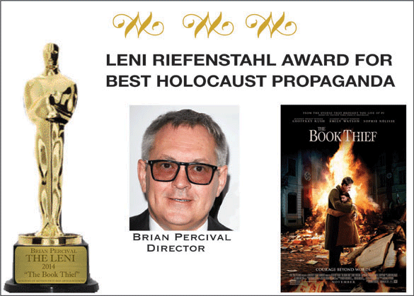 BOYLE: “Yes, I see what you mean about the similarity between the two movies. ” KALE: “But the similarity is more than a superficial. The New York Times, whose Holocaust® sympathies are beyond question, saw fit to mock The Book Thief for being stylistically insubstantial. Here are a few choice quotes from Stephen Holden’s review. “ ‘[The Book Thief]…looks and tastes like a giant sugar cake whose saccharinity largely camouflages the horrors of the war. Like a caring dentist reassuring a frightened child, it purveys a message: “Don’t be afraid. I’ll try not hurt you, although you might feel a little pinch. ‘The actors play their characters like storybook figures imagined by a smart, curious child. ‘John Williams’s score — a quieter, more somber echo of his music for Schindler’s List — lends the film an unearned patina of solemnity, for The Book Thief is a shameless piece of Oscar-seeking Holocaust kitsch.’” BOYLE: “ ‘A shameless piece of Oscar-seeking Holocaust® kitsch.’ What a great endorsement of the Leni! Even the media’s Holocaust® bible recognizes that Holocaust® movies skew nominations.” KALE: “But this is not a new phenomenon. Remember the furour five years ago with The Reader?” BOYLE: “Something Kate Winslet said?” KALE: “Well, that’s what started it. On Aug. 4, 2005, Winslet appeared on Ricky Gervais’s satirical show Extras, and spoke about her ‘need’ to do a Holocaust® movie. I brought a clip with me. BOYLE: “Well, then, let’s look at the monitor.” KALE: “As you see, Winslet’s character not only acknowledges the pointless redundancy of Holocaust® movies, but also understands the Academy’s bias toward them; hence, her quip that she has to do one if she hopes to get an Oscar.” BOYLE: “But didn’t she later deny that she believed what her character on Extras said, and that getting an Oscar had nothing to do with her decision to do The Reader?” KALE: “She tried, but I don’t think she was convincing. She said she had forgotten all about it when she signed on to do The Reader, but given the notoriety of her Extras performance the attempt to make light of it didn’t succeed. She tried a little too hard to make light of it, which I took to be a sign of nervousness at having to backtrack to cover up a candid admission that must not be uttered. Here’s that clip, which comes from an infotainment movie show. Honestly!—The Reader is mainly a love story not a Holocaust® story? Since when does the Holocaust® get second-billing?! Besides, Winslet was not likely to admit to an interviewer that she believes that Holocaust® movies are little more than self-serving careerist schlock. That would have made her look utterly cynical, and it would have bit the hand that feeds her.” BOYLE: “I noticed that Winslet started to laugh to herself the moment the interviewer mentioned her role on Extras, as if on cue. Do you think that was the idea?” KALE: “Nobody can know for certain, but I think the interview was partly designed for Winslet to ‘recant’ her heresy in the most face-saving way possible.” BOYLE: “Of course, as we know Winslet did win the Best Actress Oscar for The Reader, thereby seeming to validate the cynicism she embodied on Extras. KALE: “If you compare both clips, Winslet is clearly more natural, relaxed and direct as the fictitious nun than she is as herself. Now, that may not be unusual—many performers are uncomfortable being themselves on camera—but I suspect that as a character in a satire, she felt free to say what she could not say as herself.” BOYLE: “And the comment at the end of the Times review of the The Book Thief adds weight to the truth of satire. KALE: “Exactly.” BOYLE: “So you pick Gravity for best picture and The Book Thief for The Leni. We’ll see what happens in a week, (to camera). That's all the time we have for this special Oscar edition of The Cutting Room. For Miriam Kale and myself, good-night) (Theme music and fade out) POSTSCRIPT, March 2: