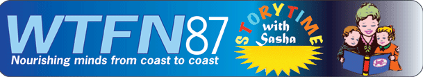 (THE SCENE: WTFN’s award-winning Saturday morning children’s show, Storytime. The set is full of the sounds of children engaged in carefree play: building, drawing and running. When storylady Sasha enters, book in hand, a bouncy theme song starts up and the happy children run to the story area. Sasha sits down on large cushion in the middle and the children are seated on smaller cushions in an arc in front of her.front. The music dies down.)